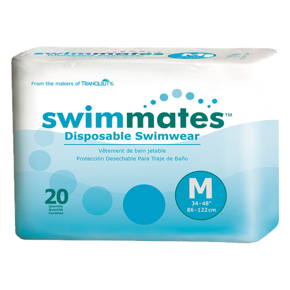 Tranquility Swimmates are a specialized type of disposable incontinence underwear designed specifically for swimming. They’re available in waist sizes ranging from 22″ (small) to 80″ (2XL).