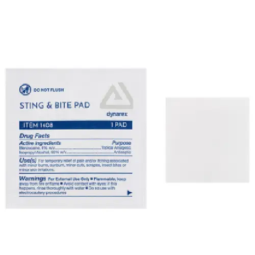 Dynarex DynaSafety Sting & Bite Pads are premium-quality wipes designed to temporarily relieve pain and irritation associated with insect stings and bites. These Bite Pads are packed in easy-to-open packets for quick access, and feature a compact size for convenient storage and portability in travel bags, first-aid kits, and backpacks.