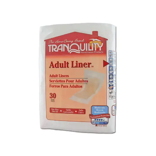 Tranquility® Adult Liners have an adhesive strip on the back, to be worn in regular underwear for a discreet appearance, helping to maintain a normal active lifestyle. Peach core has excellent absorption capacities and helps maintain skin dryness and odor reduction. Not made with natural rubber latex.