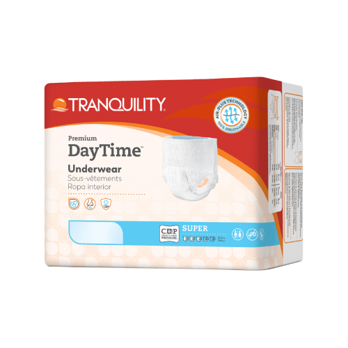 Discreet daytime protection for active individuals with heavier urine voids. The Tranquility Premium DayTime Underwear is a pull-up style incontinence underwear that can absorb up to 25 oz of fluid. The added absorbency provides all-day protection for managing moderate to heavy incontinence.